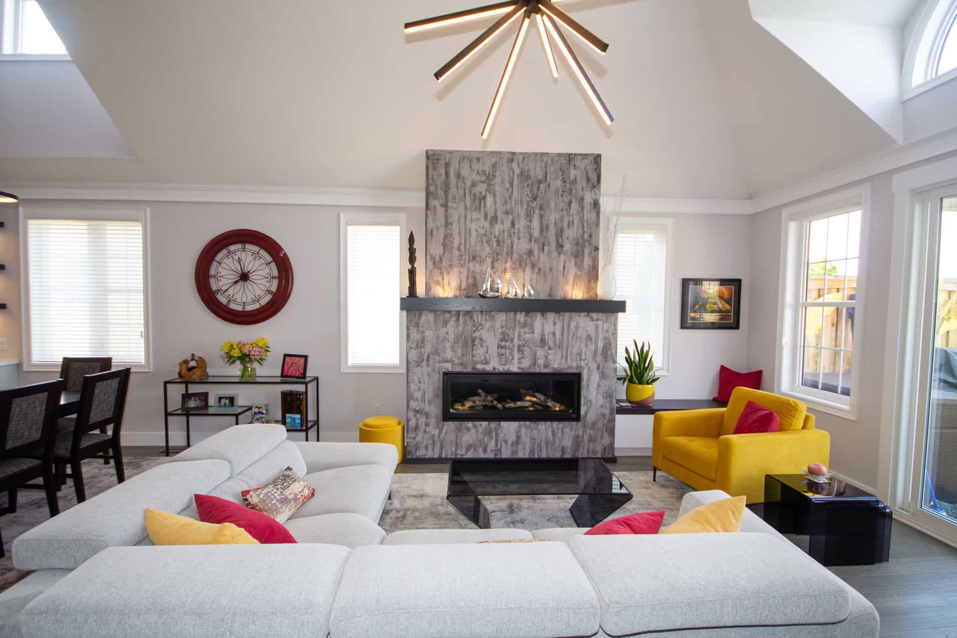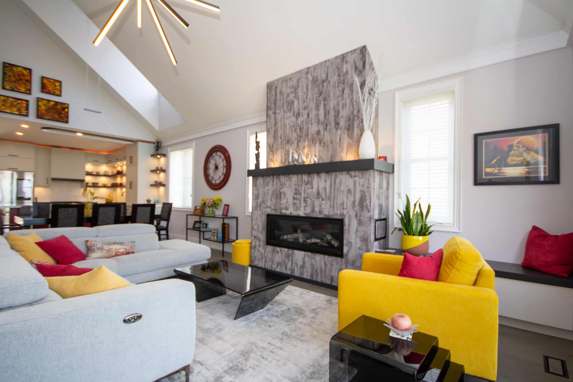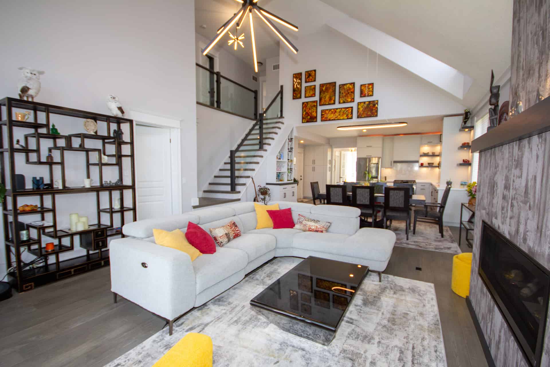 The clients had very unique ideas with a very modern edge. Bold colours and sleek lighting to transform the open-concept kitchen, living and dining room.
