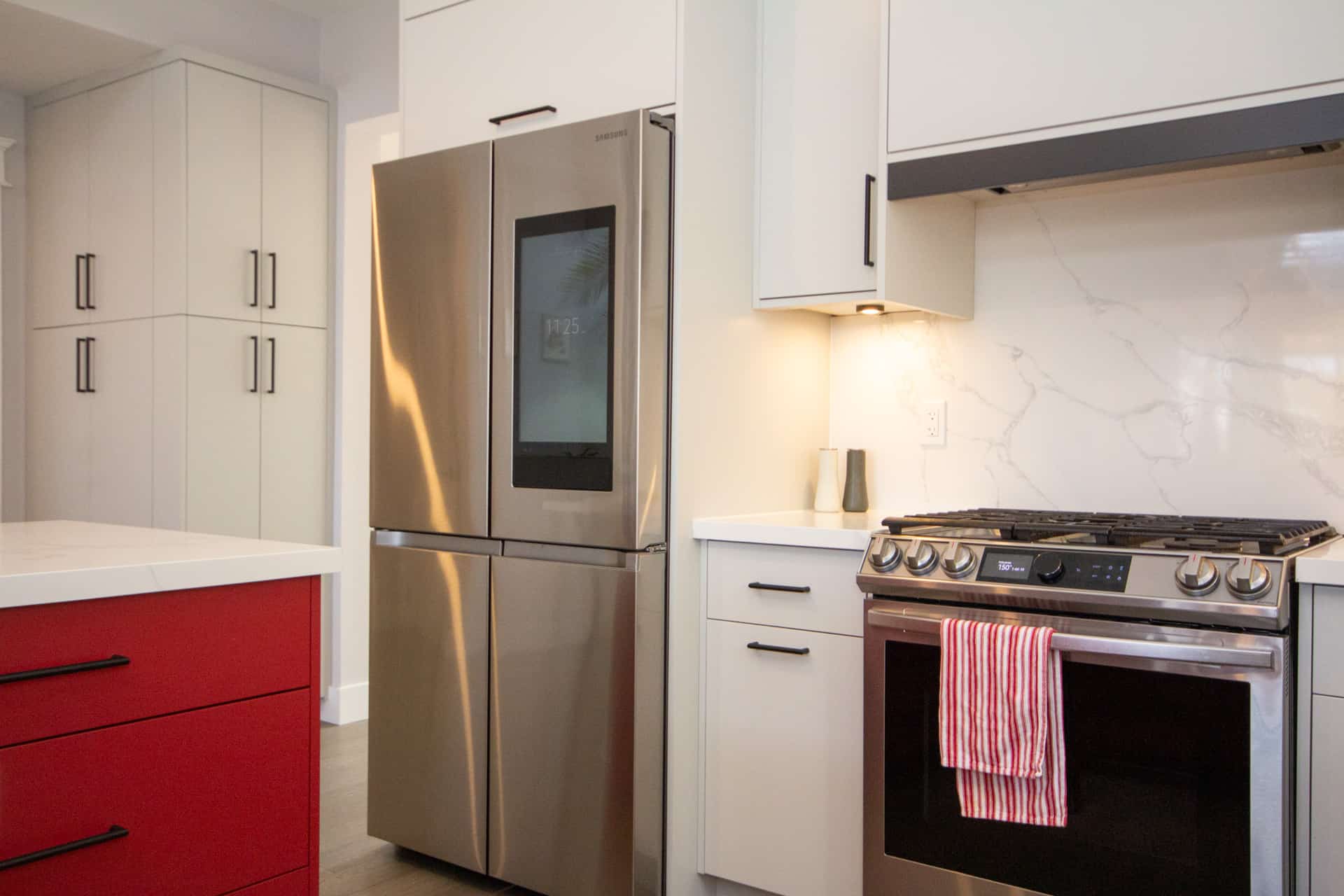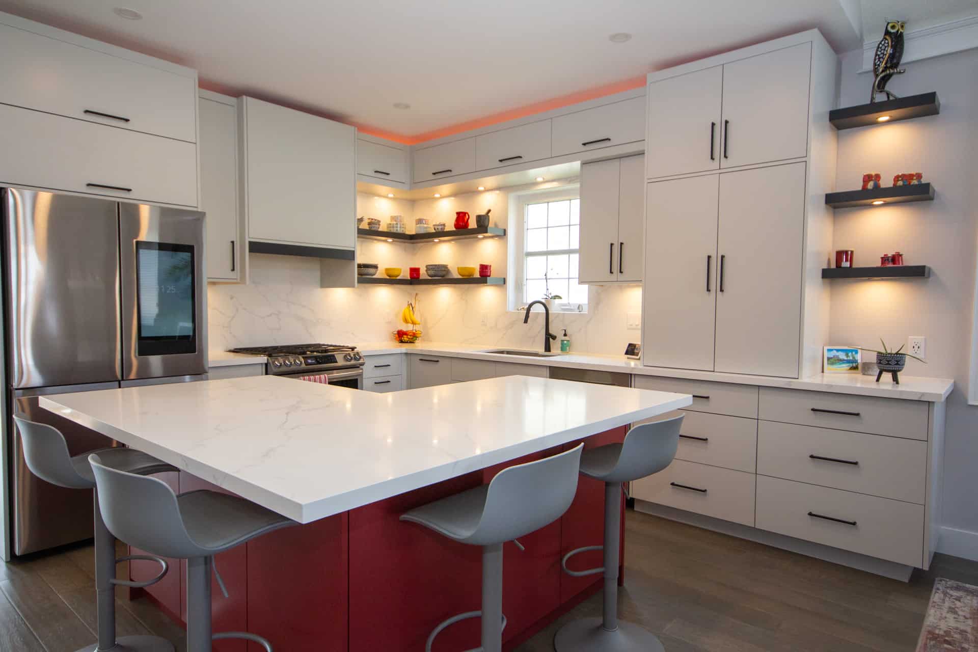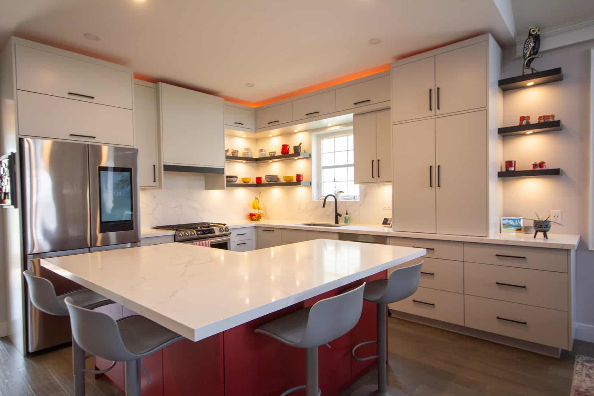 The clients had very unique ideas with a very modern edge. Bold colours and sleek lighting to transform the open-concept kitchen, living and dining room.